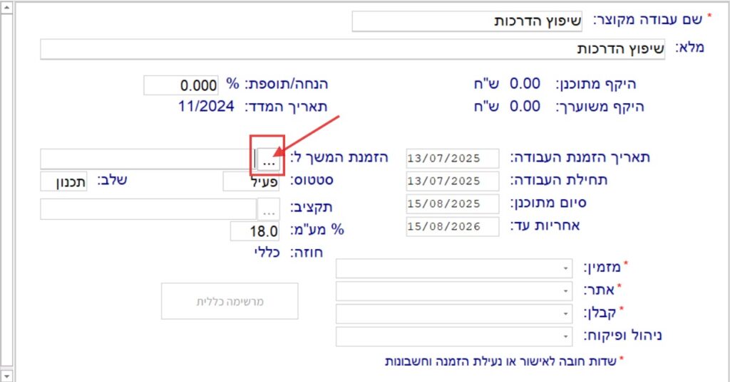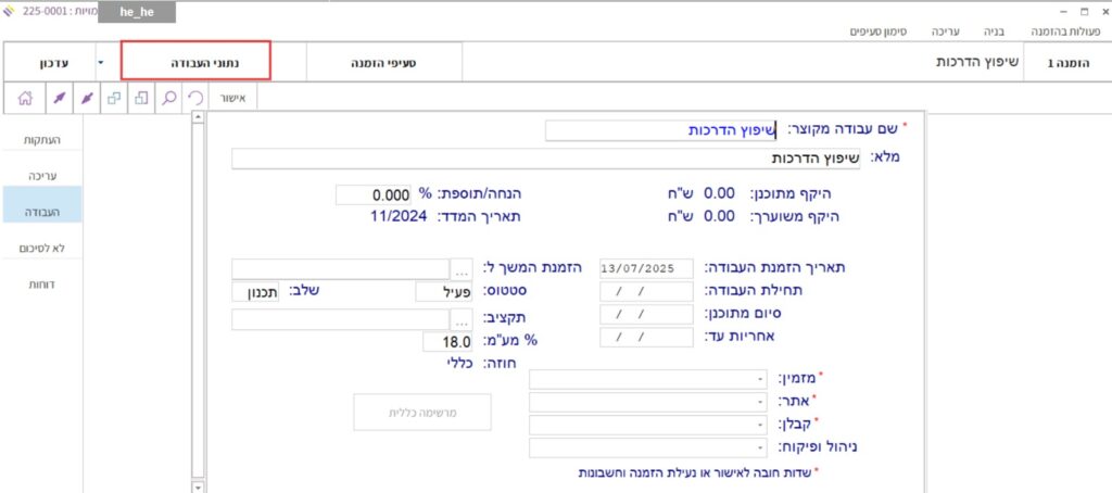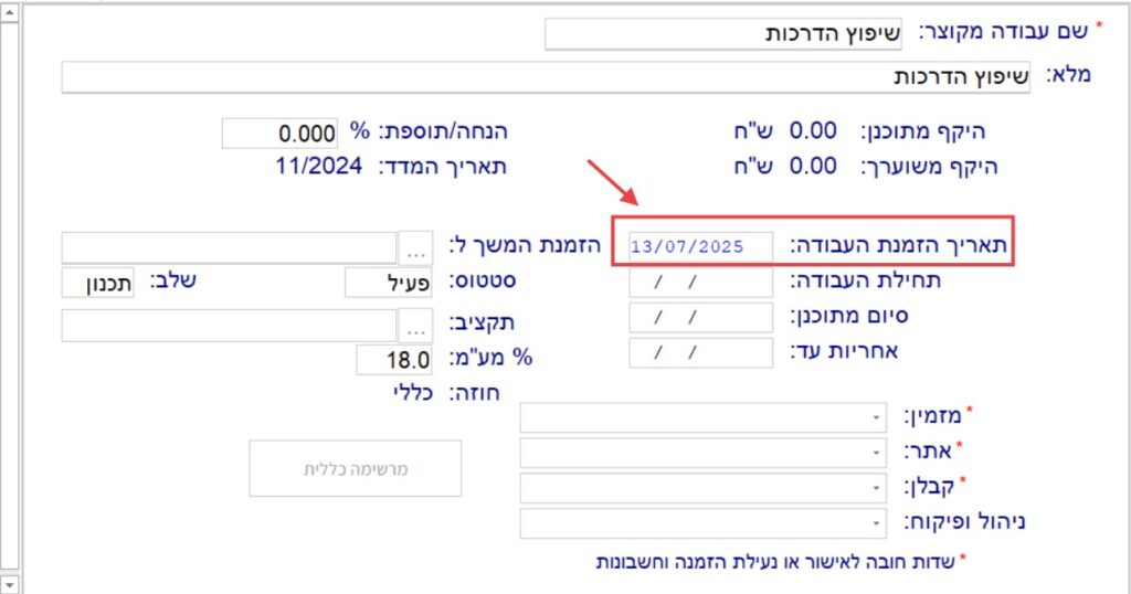 בשלב הקודם יצרנו את הזמנת העבודה החדשה, וכעת נגדיר את נתוני העבודה של הזמנת העבודה.