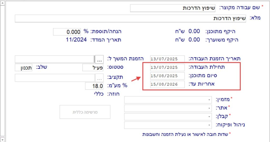 2.2 ניתן להשלים את התאריכים בשדות “תחילת העבודה”, “סיום מתוכנן”, ו”אחריות עד” – אלה הם שדות רשות, ניתן להשאירם ריקים: