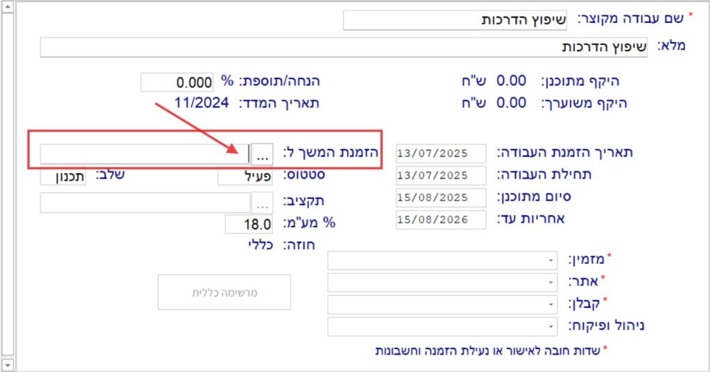 אם הזמנת העבודה החדשה היא הזמנה משלימה, ורוצים לשייך אותה להזמנה קודמת, יש למקם את הסמן בשדה “הזמנת המשך ל:”