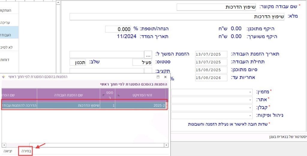 לאחר שלוחצים על הכפתור של שלוש הנקודות בשדה “הזמנת המשך ל” נפתח חלון שמציג את הזמנות העבודה הקיימות להסכם המסגרת. יש לסמן את ההזמנה שאליה רוצים לשייך את ההזמנה החדשה, ואז ללחוץ למטה על “בחירה”: