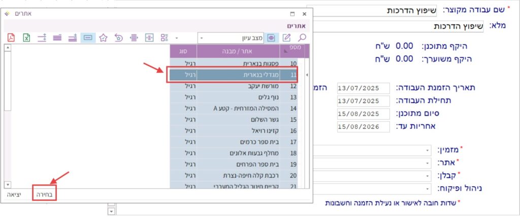 2.4 בחירת אתר העבודה – בשדה “אתר” יש לבחור מהרשימה הנפתחת את האתר שבו מבוצעת העבודה וללחוץ על “בחירה”: