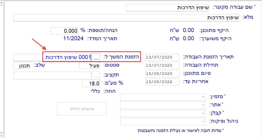 לאחר שבחרנו את הזמנת העבודה שאליה אנחנו רוצים לשייך את ההזמנה החדשה, יופיע הזיהוי שלה בשדה “הזמנת המשך ל”: