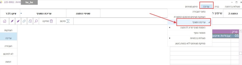 1. במסך של כתב הכמויות של הזמנת העבודה, להיכנס בצד ימין למעלה לתפריט “עריכה” > ולבחור “עריכת הסעיף”: