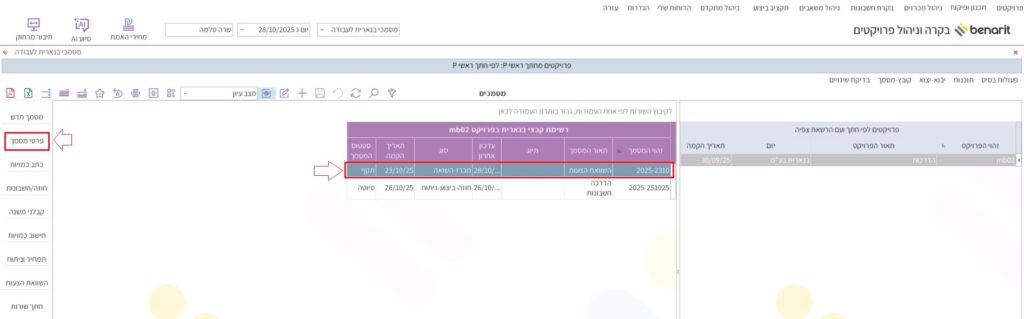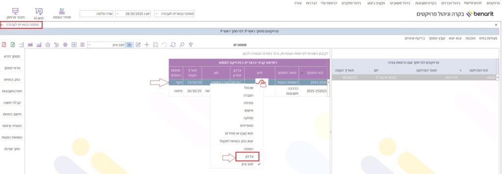 1. במסך “מסמכי בנארית לעבודה” לסמן את המסמך שאת פרטיו רוצים לעדכן וללחוץ לחיצה ימנית על העכבר.