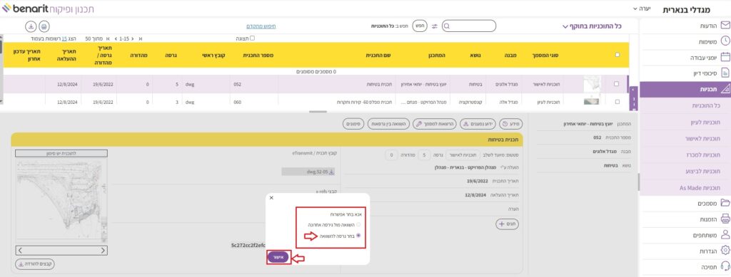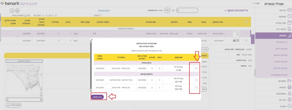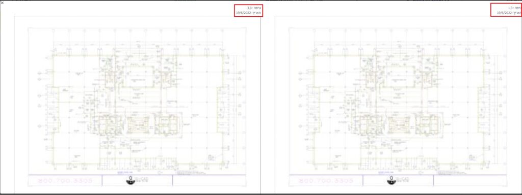 3. אם ההשוואה האוטומטית בין הגרסה העדכנית של התוכנית לבין הגרסה הקודמת לא הושלמה בהצלחה, תיפתח חלונית של השוואה ידנית שמציגה את הגרסה העדכנית ואת הגרסה הקודמת זו לצד זו, עם אפשרות לעשות זום אין ולהזיז את השרטוט למקום הרצוי כדי להשוות אזורים שונים בשרטוט. מעל כל גרסה מופיע מספר הגרסה והתאריך בו הועלתה. כך נראית חלונית ההשוואה הידנית בין הגרסאות: