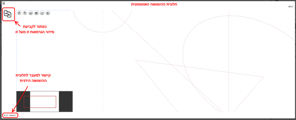 2. אם קיימת לתוכנית רק גרסה אחת קודמת, וההשוואה האוטומטית בין הגרסאות הושלמה בהצלחה, תיפתח חלונית שמציגה את ההשוואה האוטומטית: שרטוט על גבי שרטוט, כשהשינויים מודגשים בצבעים שונים. בחלונית ההשוואה האוטומטית ניתן לשנות את סידור הגרסאות, כלומר לקבוע האם השינויים בין הגרסאות יוצגו כאשר הגרסה העדכנית מונחת מעל הגרסה הקודמת, או להיפך, להציג את השינויים כאשר הגרסה הקודמת מונחת מעל הגרסה העדכנית. כמו כן, מופיע בחלונית ההשוואה האוטומטית כפתור של השוואה ידנית שמאפשר לפתוח את הגרסאות זו לצד לצורך השוואה ידנית. כך נראית חלונית ההשוואה האוטומטית: