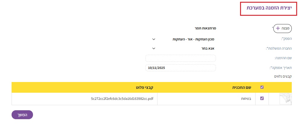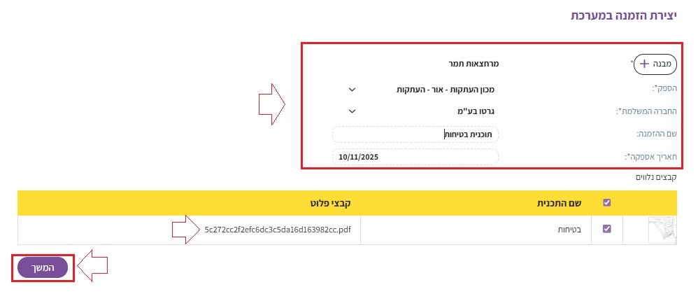 4. בחלון הנ“ל יש לבחור את מכון ההעתקות הרצוי, את הגורם המשלם, להזין שם הזמנה, ולהגדיר תאריך אספקה רצוי. שם התוכנית והקבצים הנלווים הרלוונטיים (קבצי פלוט ו-PDF) יופיעו אוטומטית בהזמנה. ללחוץ על “המשך“.