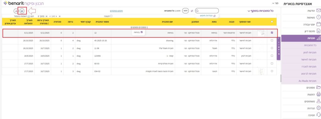 2. ברשימת התוכניות לסמן את התוכנית שממנה רוצים להזמין את הפלוט (ניתן לסמן מספר תוכניות ובלבד שהן שייכות כולן לאותו מבנה וללחוץ למעלה על הכפתור “צור הזמנה” (הכפתור עם ציור המדפסת):