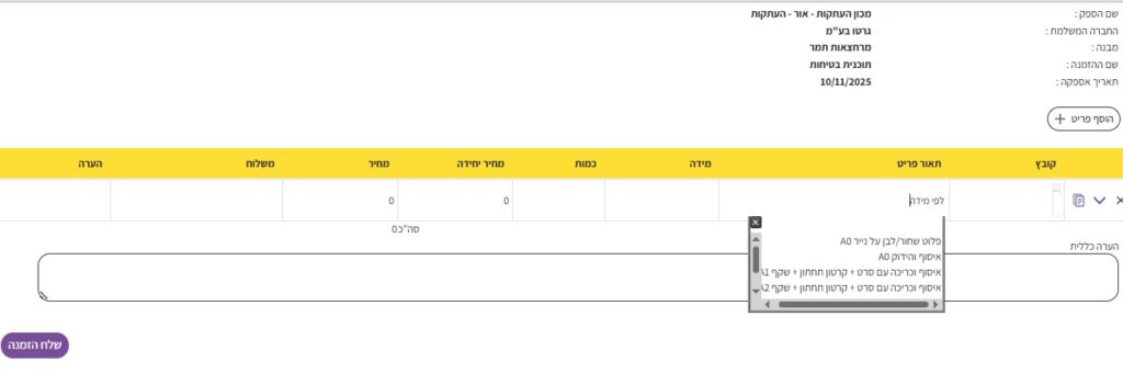 כדי להוסיף פריט לשורה ניתן ללחוץ על הכפתור “הוסף פריט+”