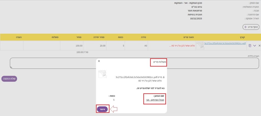 6. נפתחת חלונית “משלוח פריט” בה ניתן לבחור את שם הנמען מבין משתתפי הפרויקט או משתתף חיצוני. לוחצים על אישור:
