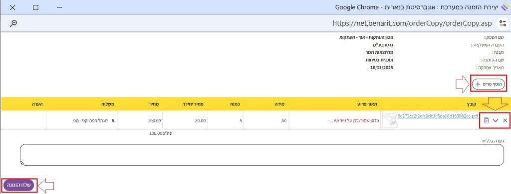 בשדה “הערה כללית” ניתן לכתוב הערות למכון ההעתקות. לסיום, ללחוץ על “שלח הזמנה”: