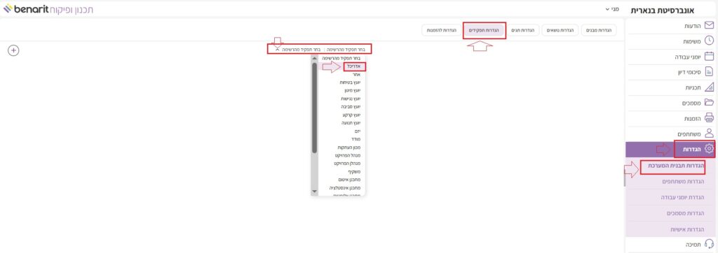 1. בבנארית תכנון ופיקוח, נכנסים ל”הגדרות” > “הגדרות תבנית המערכת” > ללשונית “הגדרות תפקידים” > בוחרים תפקיד מהרשימה: