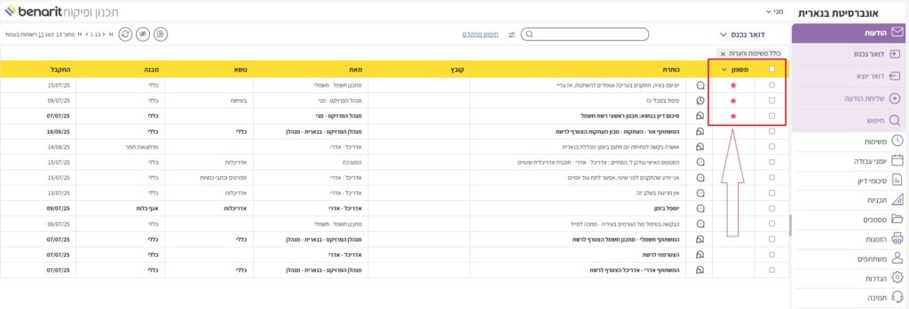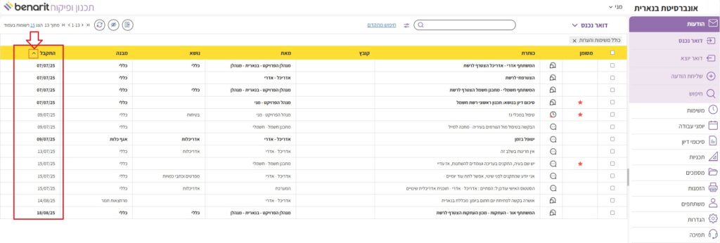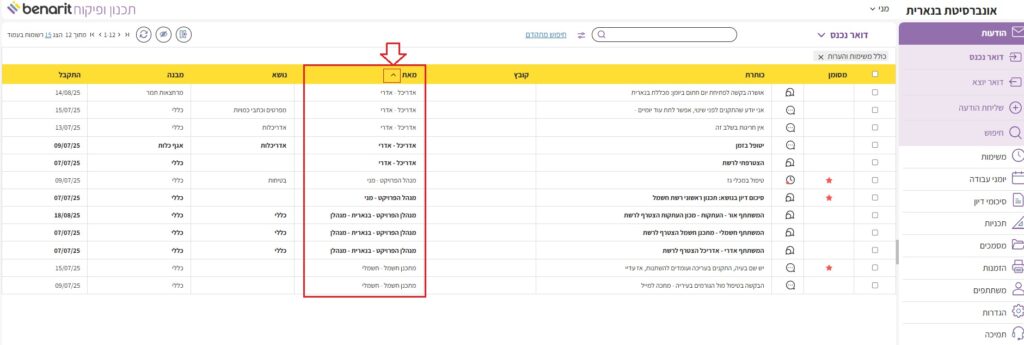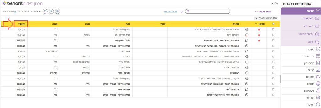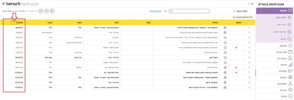כדי לשנות את מיון ברירת המחדל, יש ללחוץ על שם העמודה שלפיה רוצים למיין. למשל, אם רוצים למיין את ההודעות על פי המועד שבו התקבלו, יש ללחוץ על שם העמודה “התקבל”: