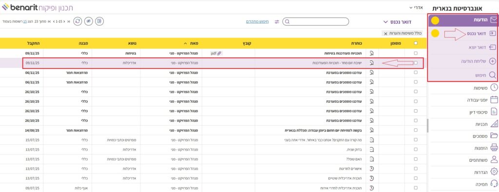1. בתפריט הימני ללחוץ על “הודעות” > “דואר נכנס”.