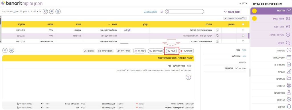 3. מעל גוף ההודעה מוצגים כפתורי פעולה. יש ללחוץ על הכפתור “מענה”: