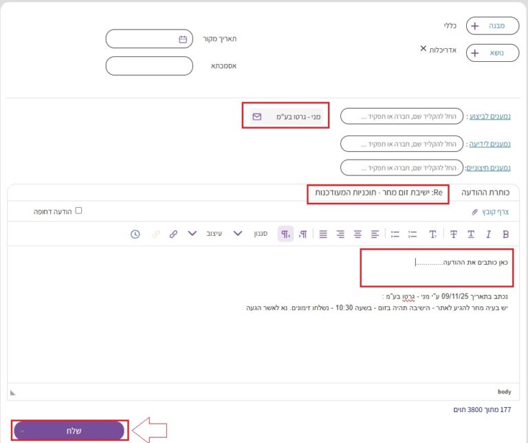 4. בחלון שנפתח, כבר מופיע שם שולח ההודעה המקורית כנמען. לכתוב את התשובה, ולסיום ללחוץ על “שלח”: