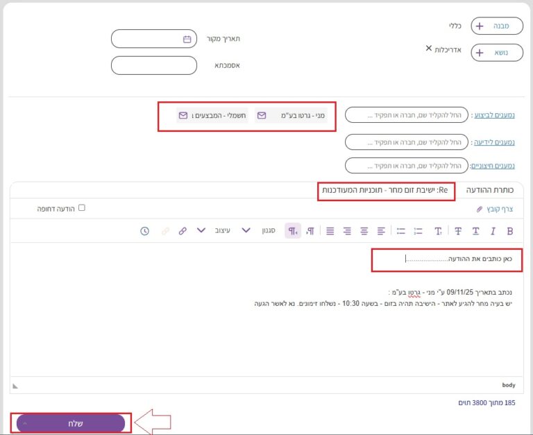 4. בחלון שנפתח לכתוב בגוף ההודעה את התשובה וללחוץ על “שלח”. התשובה תישלח הן אל שולח ההודעה והן אל כל הנמענים שמכותבים אליה: