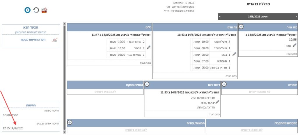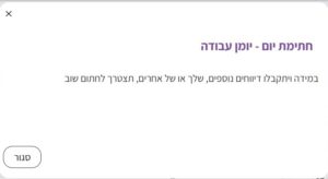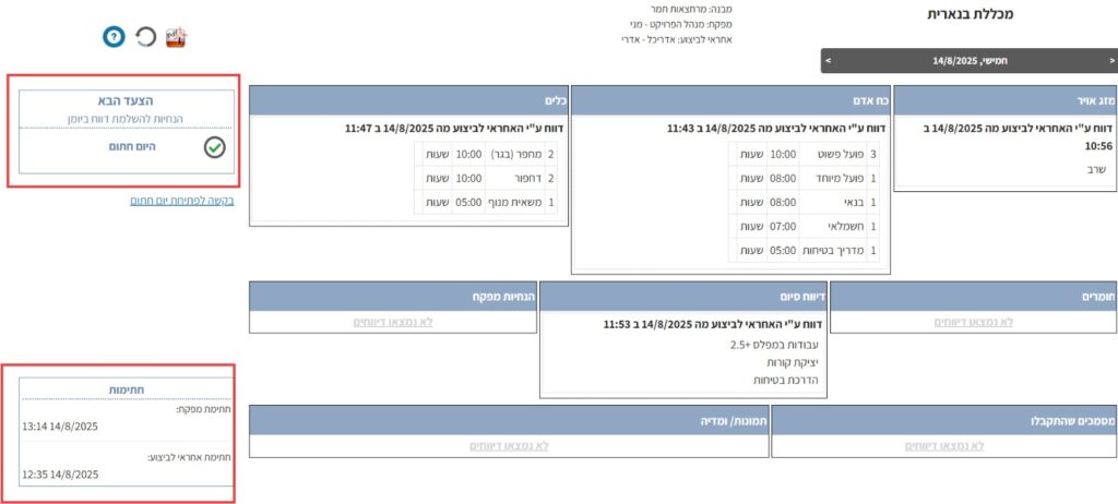 כפי שניתן לראות בצילום המסך הנ“ל, בתיבת “הצעד הבא” בצד שמאל למעלה מופיעה הודעה שהיום חתום, ומתחתיה יש קישור שבאמצעותו אפשר לשלוח בקשה לצד השני לפתוח את היום אם יש צורך להוסיף דיווחים. בצד שמאל למטה, בתיבה “חתימות, יש אינדיקציה לתאריך והשעה שבה חתמו הצדדים על היום.