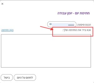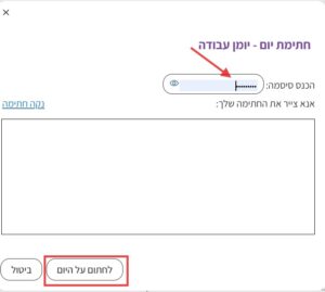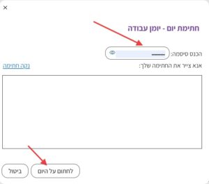 2. לאחר לחיצה על המילים “חתום כאן” תיפתח חלונית להזנת סיסמת המשתמש (המהווה חתימה דיגיטלית על היום ביומן העבודה). יש להזין את הסיסמה וללחוץ על “לחתום על היום”: