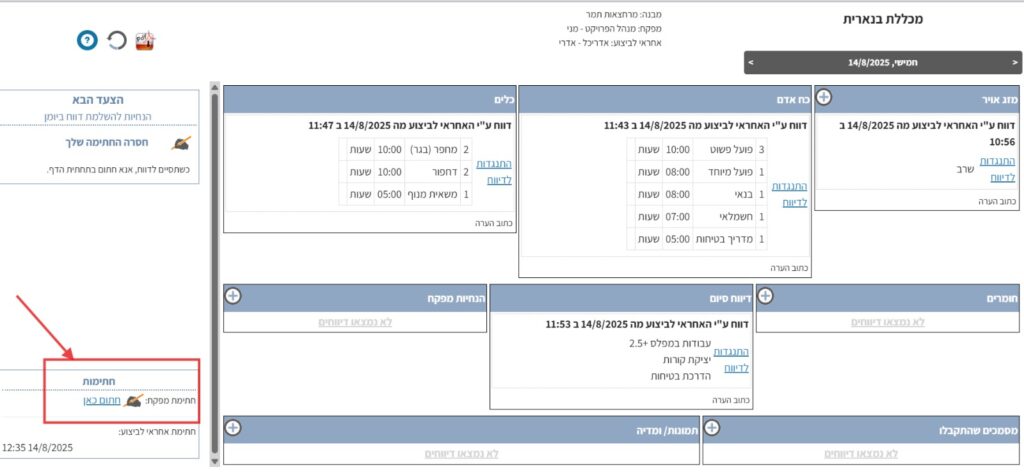 לאחר שכל דיווחי החובה מולאו, צריכים הצדדים לחתום על היום ביומן העבודה.