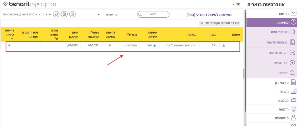 3. בחלון שנפתח כבר קיימות הגדרות שנשאבו ממשימת האב: מבנה, נושא, התחלה מתוכננת, סיום מתוכנן ודחיפות משימה – הגדרות אלה ניתנות לעדכון.