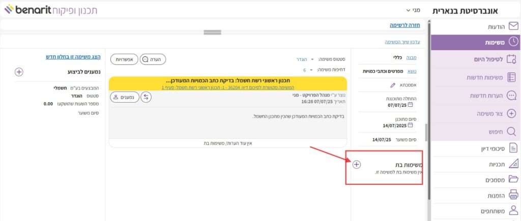 2. בצד ימין של המשימה, מתחת להגדרות המבנה, הנושא, תאריכי ההתחלה והסיום המתוכנן – מוצגות משימות הבת של המשימה, אם ישנן. כדי להוסיף משימת-בת, לוחצים שם על סימן הפלוס: