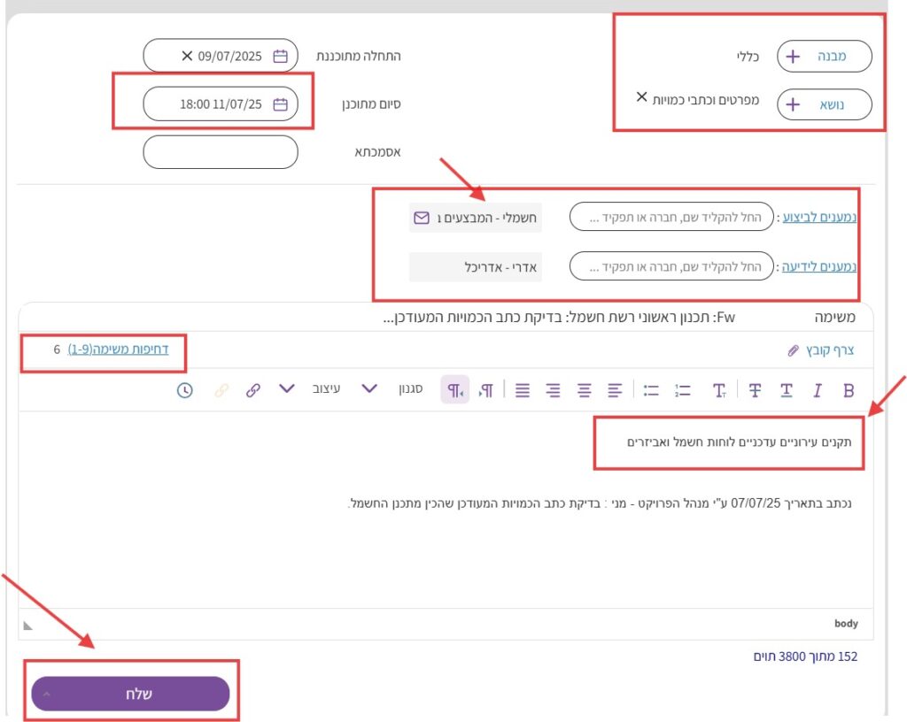 בוחרים נמענים לביצוע ונמענים לידיעה. ניתן לצרף קובץ אם נחוץ ולהקליד את כותרת ואת תוכן המשימה. לסיום לוחצים על “שלח”.