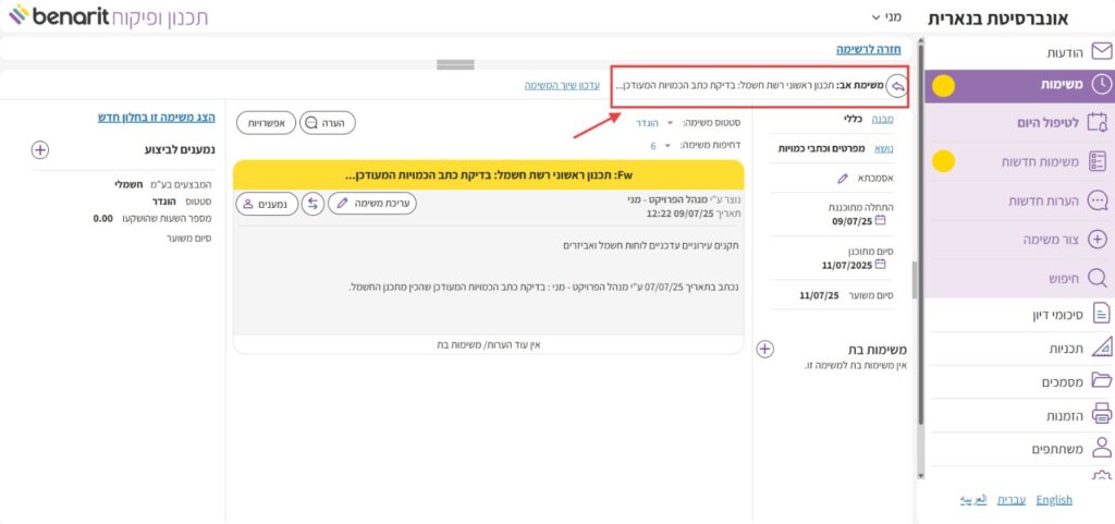 4. כאשר מעיינים במשימה שהיא משימת בת, ניתן לחזור ממנה בקלות אל המשימה שממנה היא נוצרה, באמצעות לחיצה על השורה “משימת אב” מעל תוכן המשימה: