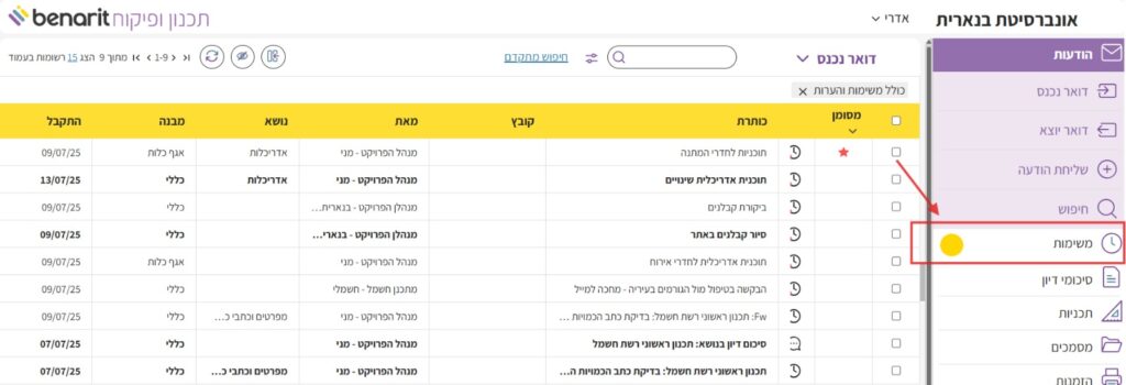 כאשר המשתמש “אדרי” נכנס ל”בנארית תכנון ופיקוח”, החיווי כאמור יופיע בתפריט הראשי לצד “משימות”: