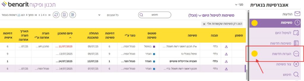 כאשר נשלחת משימה חדשה, או כאשר נוספת הערה לאחת מהמשימות, יופיע בתפריט המשימות חיווי ל”חדש” – עיגול צהוב לצד המילה “משימות”.