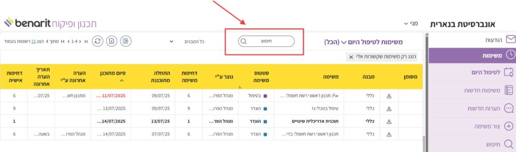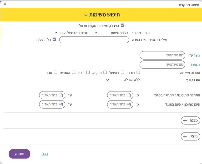 בחלונית הנ“ל ניתן להזין את הקריטריונים לחיפוש: מילים שמופיעות בתוכן המשימה או בתוכן של הערה למשימה, משימות הקשורות למבנה או נושא מסוים, משימות שנוצרו על ידי משתתף מסוים או שהוטלו על אחראי ביצוע מסוים. ניתן גם להגדיר סינון לפי סטטוס המשימה והתאריכים שלה. לסיום ללחוץ על הכפתור “חיפוש”.