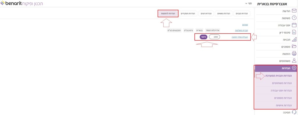 1. בתפריט הראשי של בנארית תכנון ופיקוח לבחור “הגדרות” > “הגדרות תבנית המערכת”.