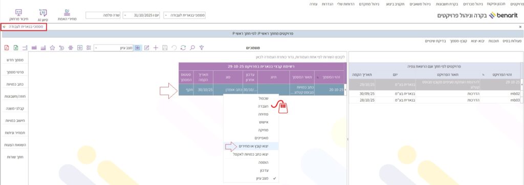 1. במסך “מסמכי בנארית לעבודה” מסמנים את הקובץ מבוסס קטלוג נת”י (נתיבי ישראל – מע”צ לשעבר) שאותו רוצים לייצא. לוחצים לחיצה ימנית בעכבר ובוחרים “יצוא קובץ או מחירים”: