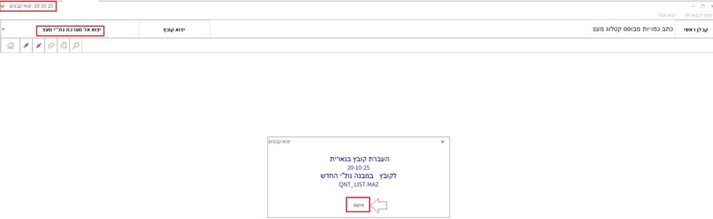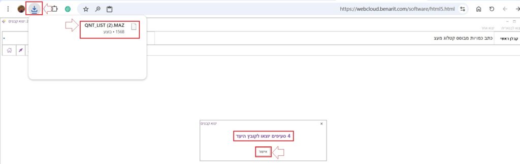 5. מתקבל חיווי לקובץ בשם  QNT_LIST.maz שנוצר בתיקיית ההורדות של המחשב והודעה על כמות הסעיפים שיוצאו. לוחצים על “אישור”: