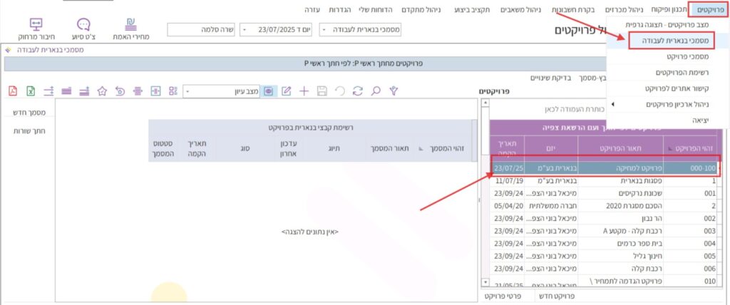 1. במסך הראשי לפתוח בצד ימין למעלה את התפריט “פרויקטים” > ולבחור בפקודה “מסמכי בנארית לעבודה” > ואז לסמן את הפרויקט שאותו רוצים למחוק.