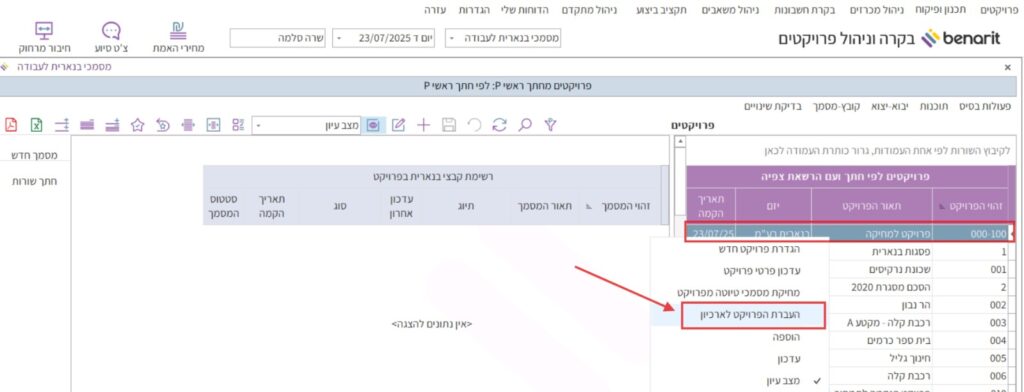2. ללחוץ לחיצה ימנית בעכבר על שם הפרויקט שאותו רוצים למחוק, ולבחור בפקודה “העברת הפרויקט לארכיון”:
