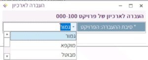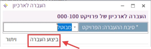 4. לאחר שבוחרים את סיבת העברת הפרויקט לארכיון ללחוץ על הכפתור “ביצוע העברה”. פעולה זו מעבירה את הפרויקט לארכיון פרויקטים שהוא מעין סל מיחזור שממנו ניתן לשחזר את הפרויקט במידת הצורך: