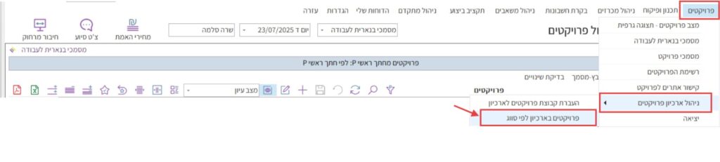 5. אם רוצים למחוק לצמיתות את הפרויקט גם מארכיון הפרויקטים, יש לגשת שוב בצד ימין למעלה לתפריט “פרויקטים” > להצביע על “ניהול ארכיון פרויקטים > ומשם לבחור בפקודה “פרויקטים בארכיון לפי סווג”: