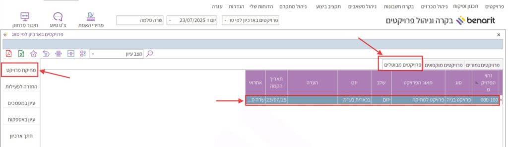 6. בחלון של ארכיון הפרויקטים יש שלוש לשוניות (“פרויקטים גמורים”, “פרויקטים מוקפאים” ו”פרויקטים מבוטלים”). להיכנס ללשונית שבה נמצא הפרויקט, לסמן אותו וללחוץ בצד שמאל על הכפתור “מחיקת פרויקט”.