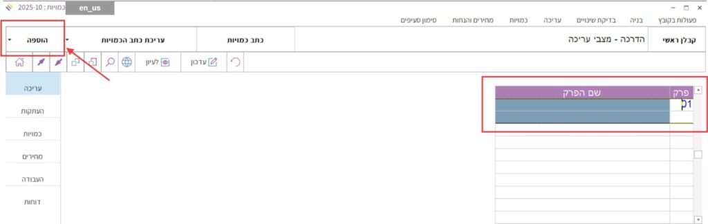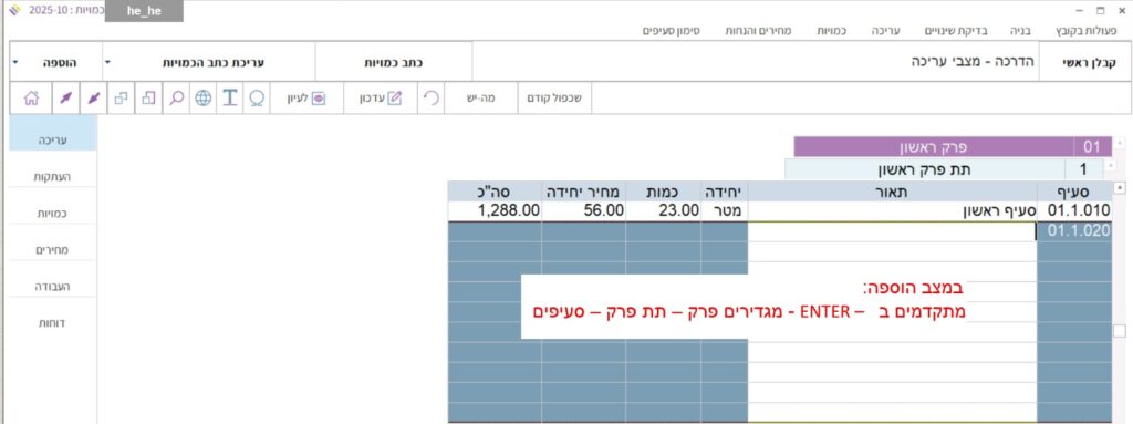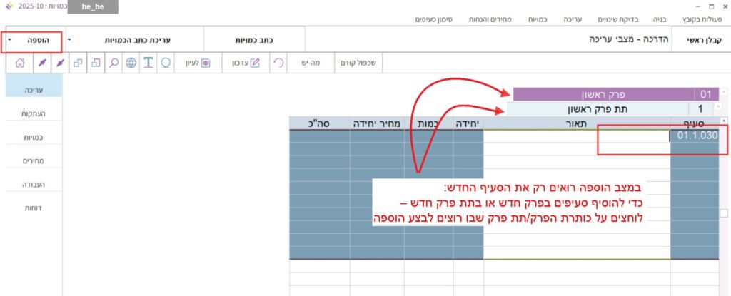 מתפריט מצבי העריכה בצד שמאל למעלה, לוחצים על ראש החץ הקטן (משמאלו של שם המצב הקיים) ובוחרים במצב העריכה “הוספה”, או בלחיצה על על כפתור “הוספה” בסרגל שמעל טבלת כתב הכמויות או בלחיצה על מקש הקיצור F4 במקלדת.