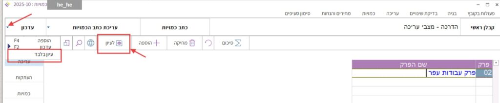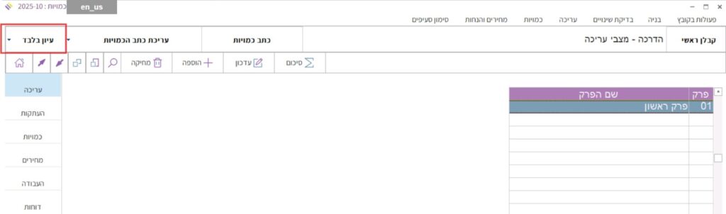 כדי לראות את שאר הסעיפים ולדפדף בין סעיפי כתב הכמויות כולו. יש לעבור למצב “עיון”.
