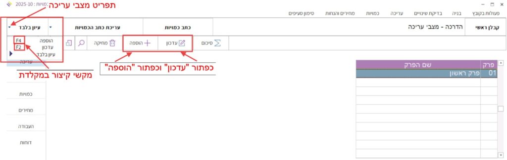 השימוש במצבי העריכה בכתב הכמויות: