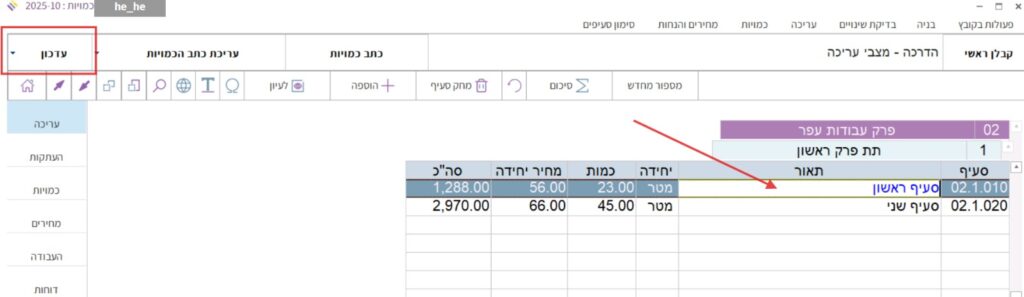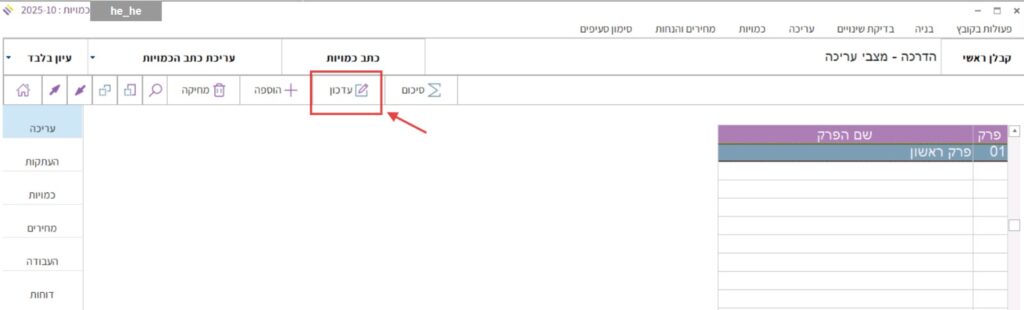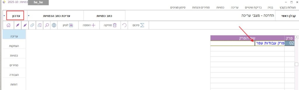 כדי לעדכן את מספר הפרק או את שם הפרק נלחץ על כפתור “עדכון” בסרגל שמעל טבלת כתב הכמויות: