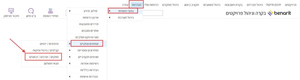 1. במסך הראשי של בנארית פרו להיכנס למעלה אל התפריט “הגדרות”> “נתוני תשתית” > להצביע על “שותפים עסקיים” > ולבחור “ספקים/יצרנים/יבואנים”: