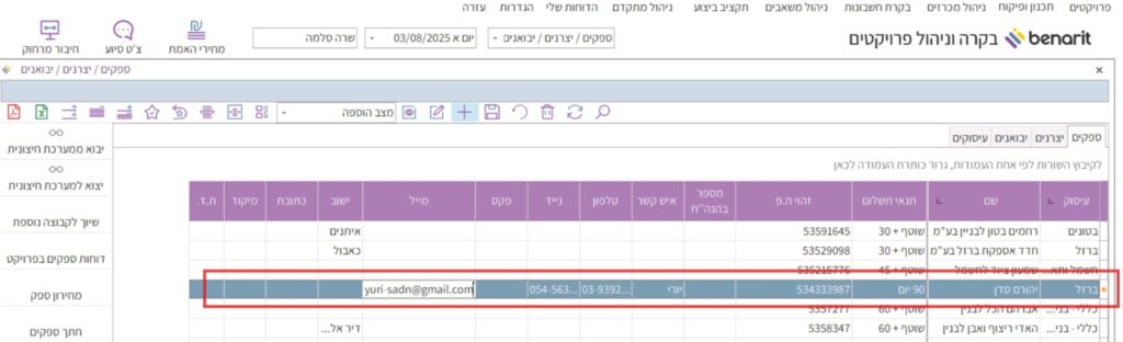 4. הנה כך נראית רשומה של ספק חדש לאחר מילוי הפרטים: