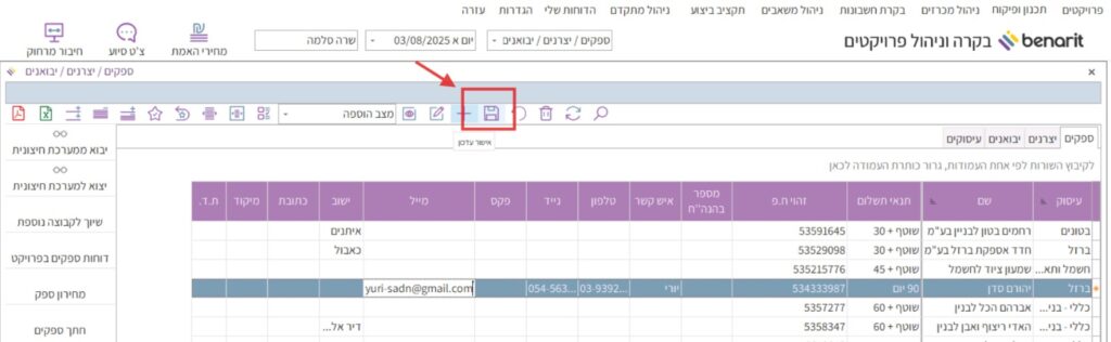 5. לסיום קליטת הרשומה של הספק החדש לתוך מסד הנתונים, ללחוץ למעלה על הכפתור “אישור עדכון” (הכפתור עם ציור הדיסקט):