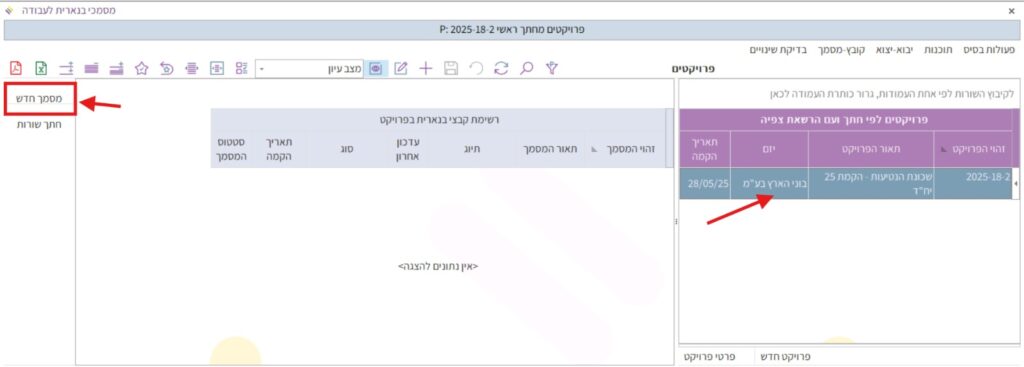 3. לסמן ברשימת הפרויקטים את הפרויקט, וללחוץ על “מסמך חדש” בסרגל הכפתורים השמאלי.