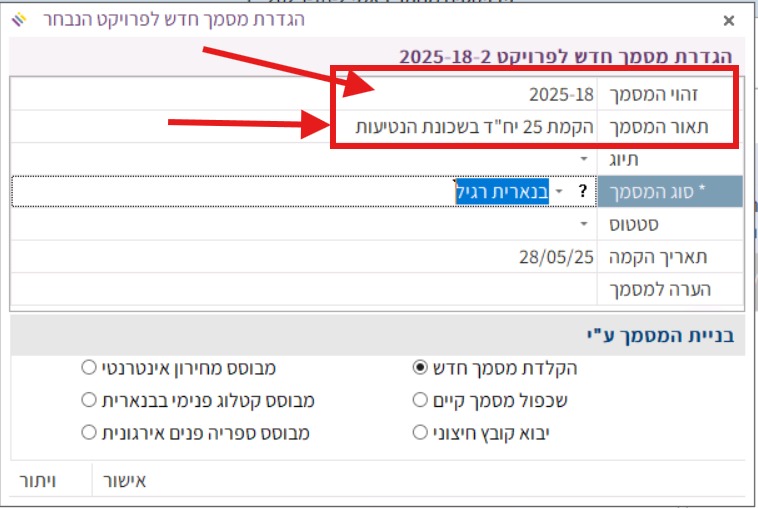 4. להקליד זיהוי מספרי בשדה “זהוי המסמך” ותאור מילולי של העבודה בשדה “תאור המסמך”.