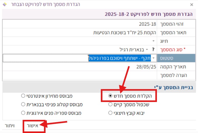 6. תחת הכותרת “בניית המסמך ע”י”, לסמן את האפשרות “הקלדת מסמך חדש” וללחוץ על “אישור”.