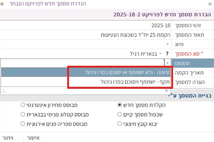 5. בשדה “סטטוס” לבחור את סטטוס המסמך, “תקף – ישתתף ויסוכם בפרו ניהול ” או “טיוטה – ולא ישתתף או יסוכם בפרו ניהול”.